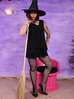 Drop-dead gorgeous Ammalia as a sexy witch flashes her legs in black patterned pantyhose