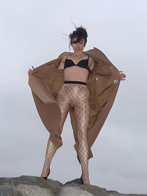 Brunette woman Eve wearing fishnets over shiny seamless pantyhose, opens her coat outdoors by an old castle
