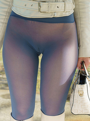 Beauty Jeny without panties and skirt poses in her blue seamless pantyhose outside