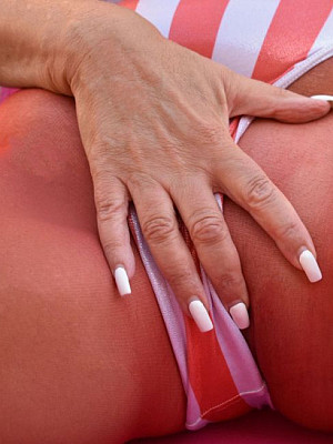 Busty redhead mature babe Samantha waiting for the sun rise in the star-spangled swimsuit, red seamless pantyhose and high-heeled shoes