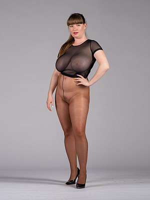 Fat woman with huge tits under a sheer blouse poses in pantyhose for a photo session